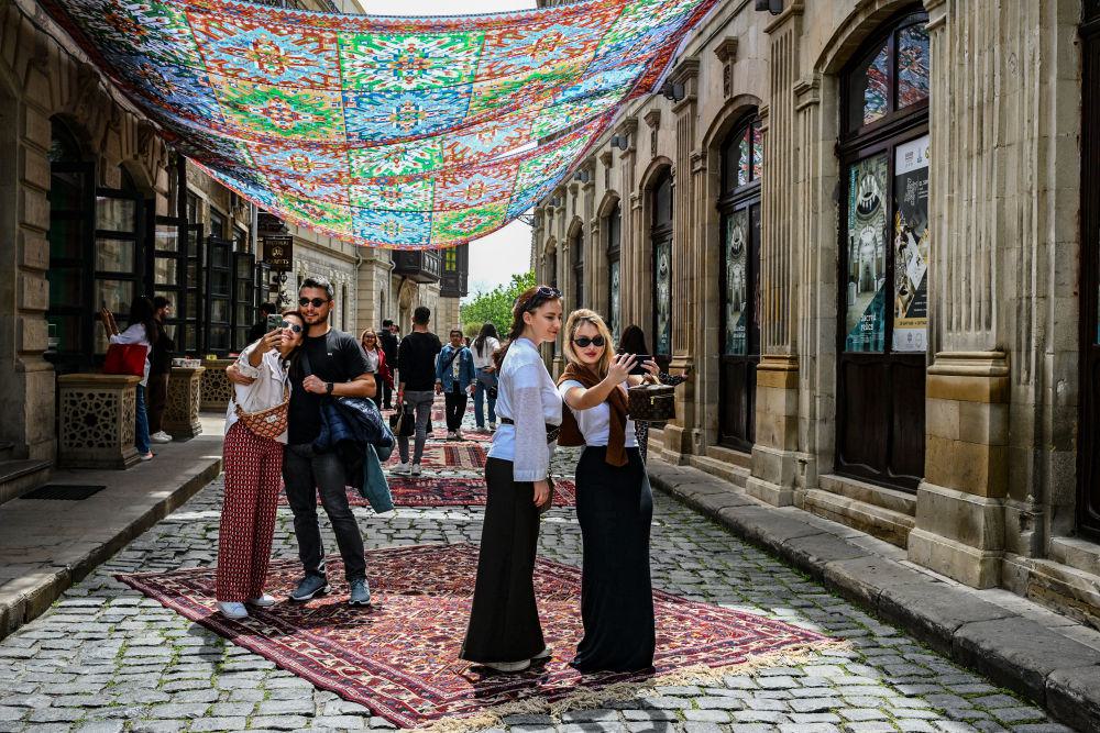 游客在阿塞拜疆首都巴库举行的国际地毯艺术节上自拍。新华社发(托菲克·巴巴耶夫摄)
