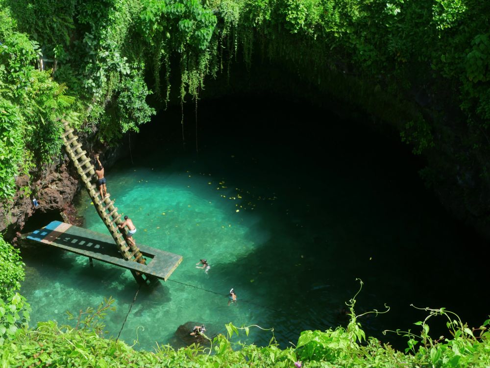 这是萨摩亚著名景区——心形海沟。心形海沟也被称为“天坑”,因其形状酷似心形而得名(2025年12月15日摄)。新华社发(王彤摄)