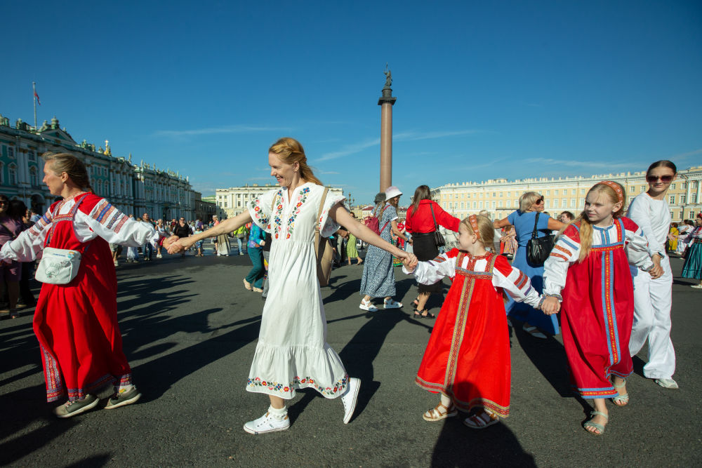 人们在俄罗斯圣彼得堡冬宫广场跳圆圈舞。新华社发(莫京娜摄)