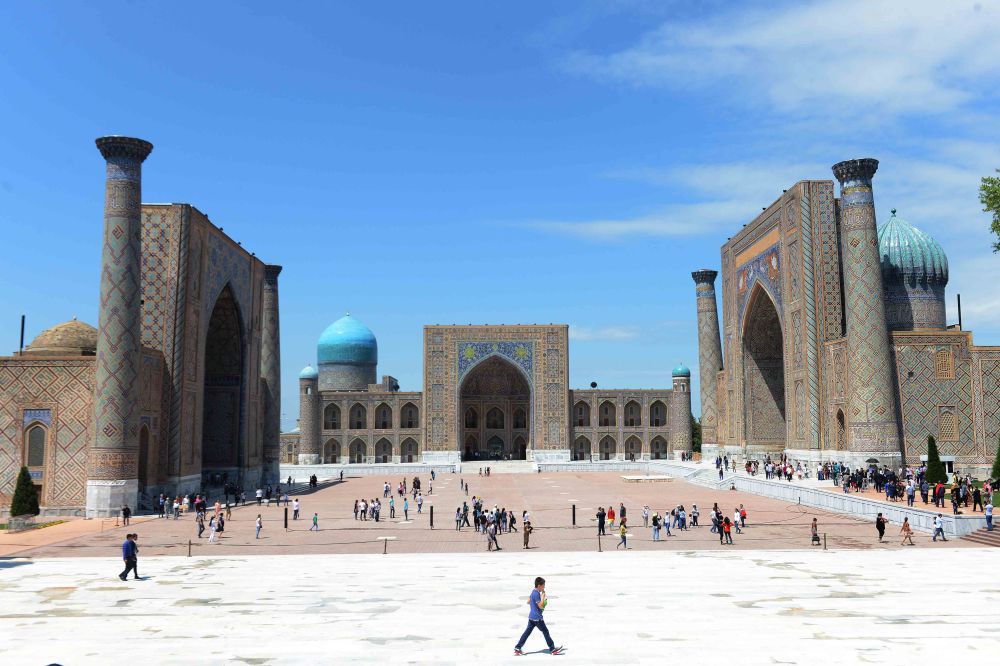 人们在乌兹别克斯坦撒马尔罕市列吉斯坦广场游览。新华社记者沙达提摄